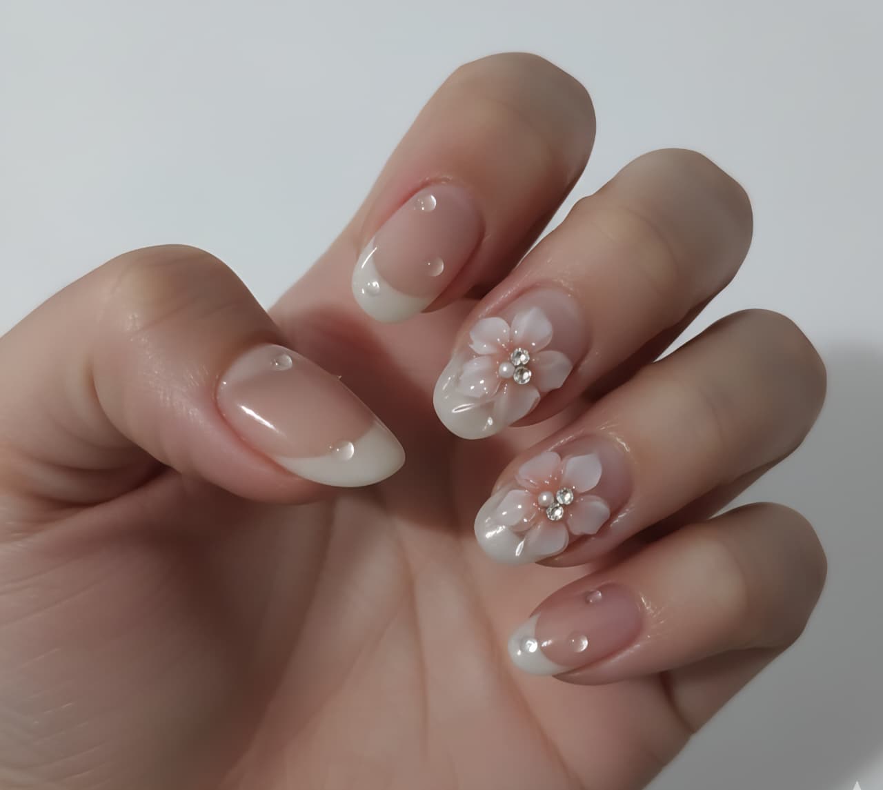 Our artists place each 3D flower by hand, so the design feels intentional and balanced. The result looks delicate but still strong enough for regular wear. The French base elongates your fingers visually, and the floral elements make the nails appear more luxurious in photos and real life.