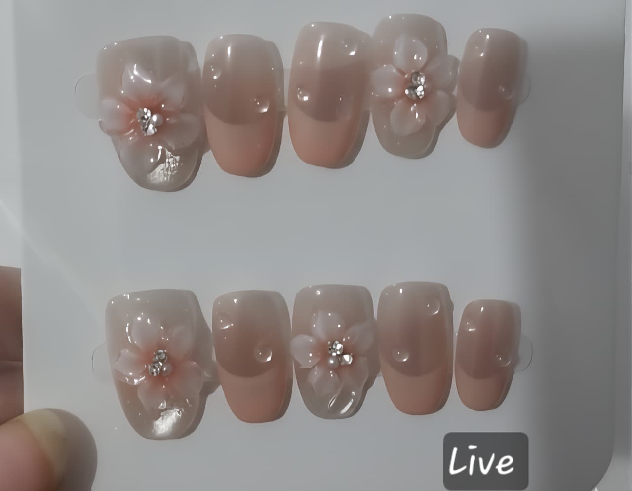 We use high-quality gels and topcoats that keep the French base fresh and the 3D flowers secure. Since the set is reusable, you can remove the nails carefully and wear them again for future events. For quick styling or short wear, adhesive tabs work well. However, if you want full-day or multi-day hold, nail glue gives a stronger grip.