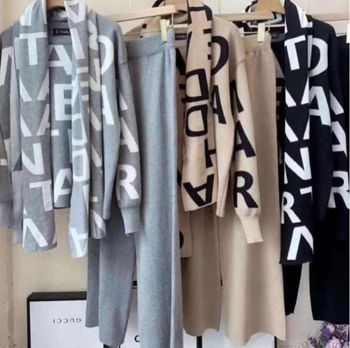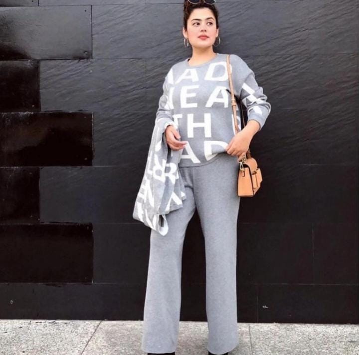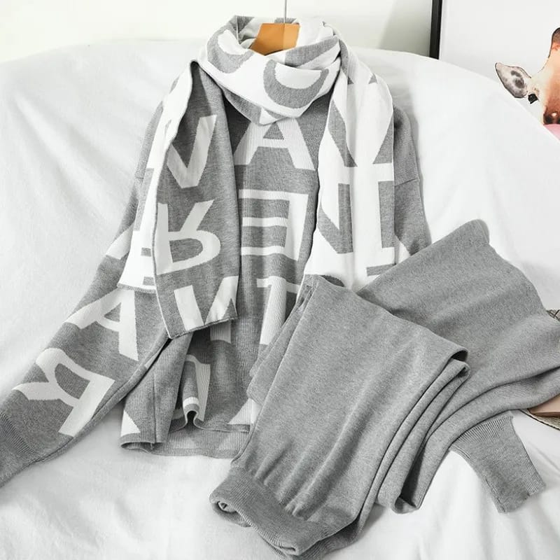 Imported warm Alphabet Coord Set with 3 pieces (top + bottom + stole). Free size fits up to 44 bust and 36 waist. Soft, cozy fabric and perfect for winter styling. Available in Grey, Black and Beige.