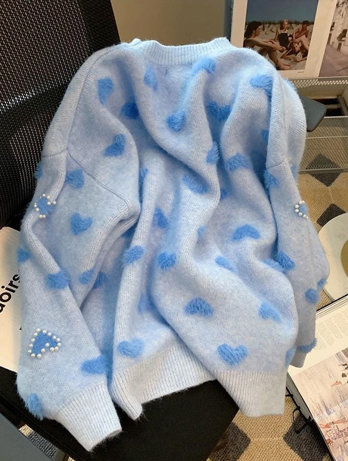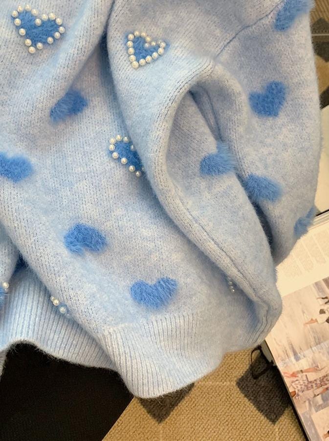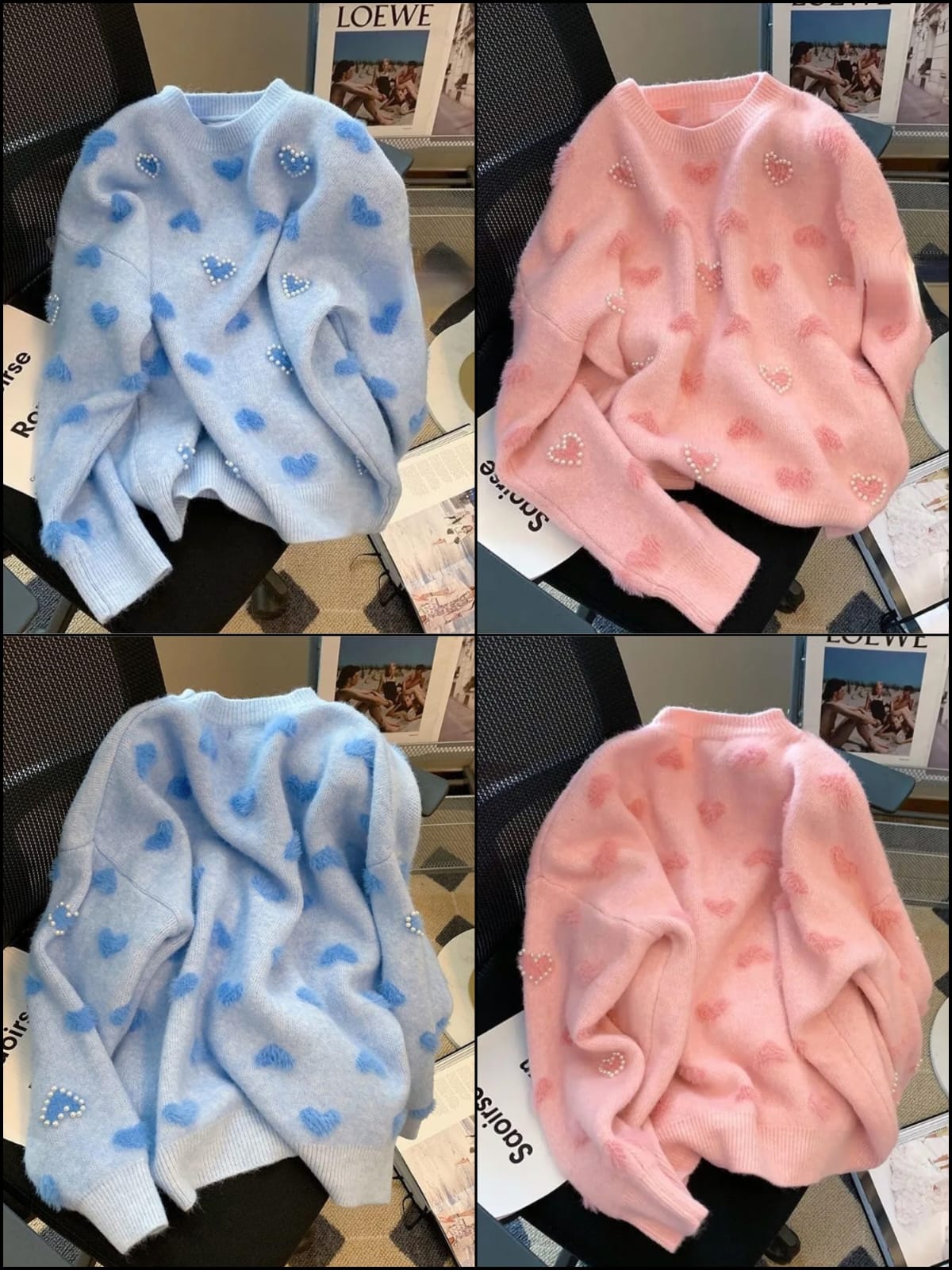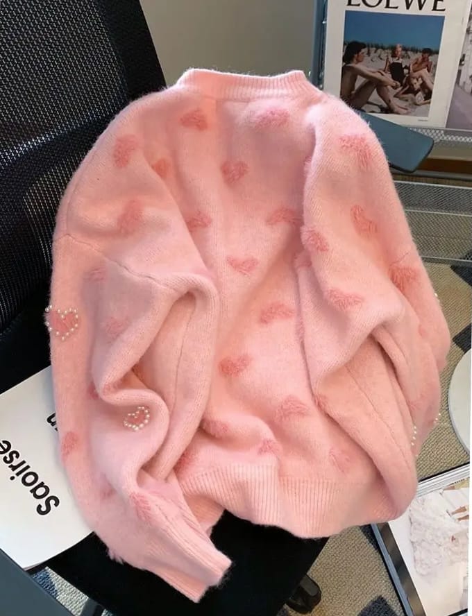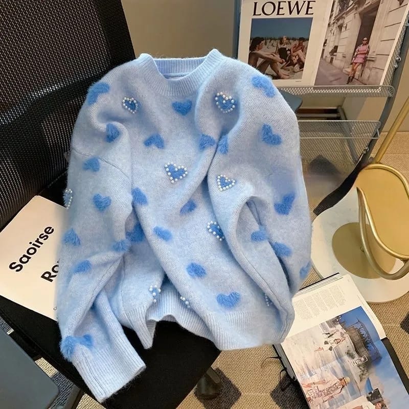 ❤️ Premium Winter Pullover with Heart Print & Pearl-Fur Details