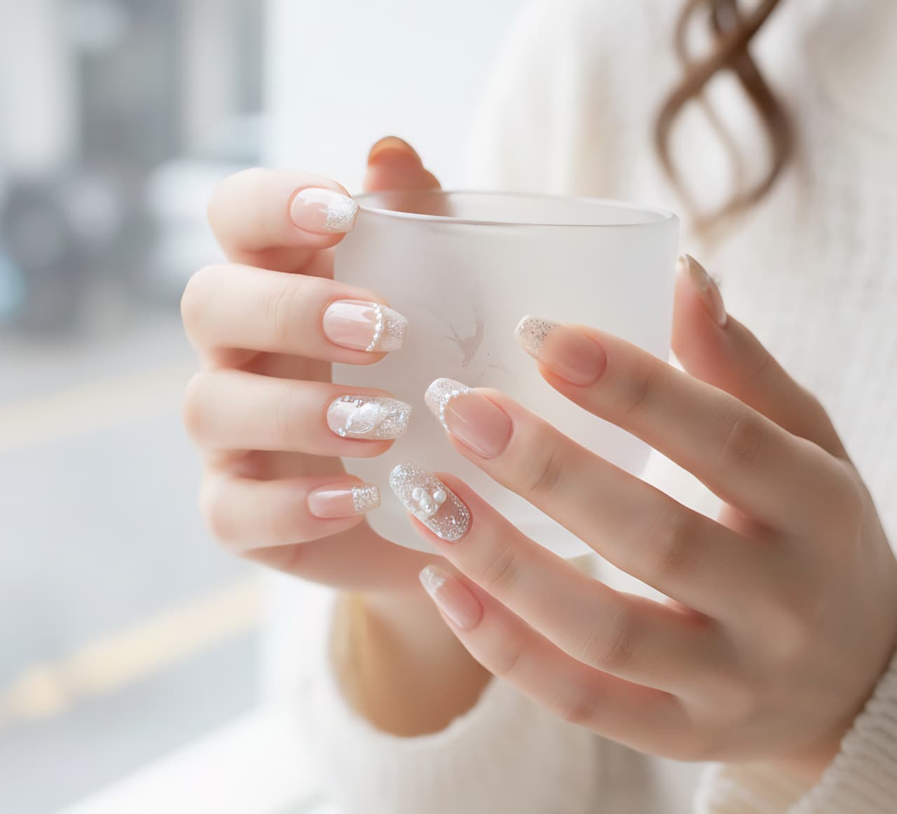 Pair the Bellerina French Pearl Nails with pastel lehengas, sarees, gowns, western outfits, office wear, party fits or simple everyday attire. Their natural look blends into every style seamlessly.