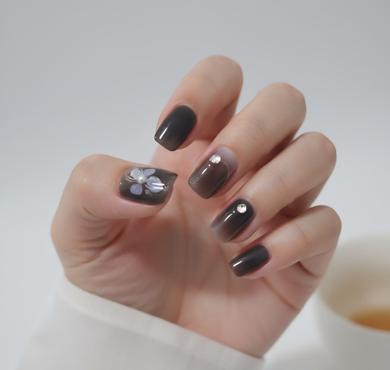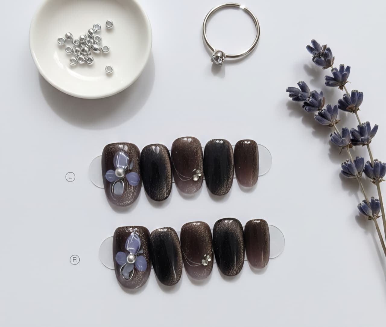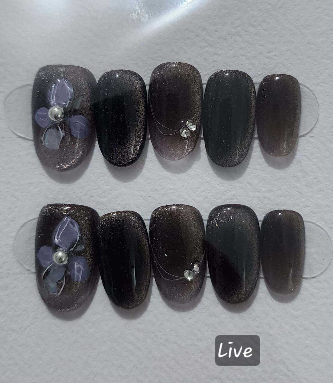 Each nail is handcrafted with precision. Our artists magnet-align the cat-eye streak for an even reflective shimmer, then add floral detailing that stands out against the glossy dark surface. The final gel topcoat seals everything with a high-gloss finish, making the nails look professionally styled and photo-ready.
