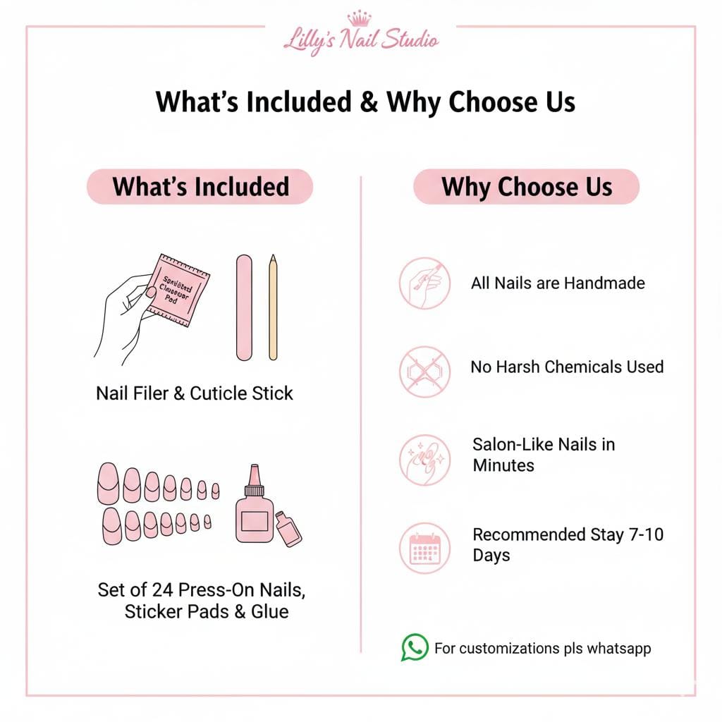 Celebrate the season with our Christmas Press-On Nails, designed to give your hands a bright, cheerful and festive makeover. These nails come in 24 different sizes, ensuring a perfect fit for every finger so you never have to worry about size issues. Moreover, each nail is crafted with premium quality and handmade finishing, giving you the same smooth, flawless look you get from a salon. Whether you’re dressing up for Christmas parties, holiday dinners, photoshoots or winter outings, these nails add the perfect touch of Christmas charm.