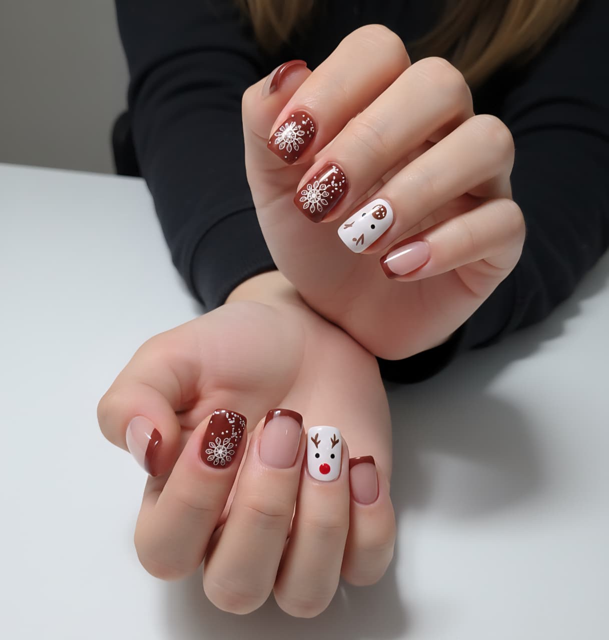 Each nail is handcrafted with detailed snowflake accents, clean winter shading and a glossy gel topcoat that reflects beautifully under Christmas lights, party décor and photoshoot lighting. The cute reindeer art adds a fun, playful element while still keeping the design premium for holiday dinners, Christmas parties, winter trips and gifting.