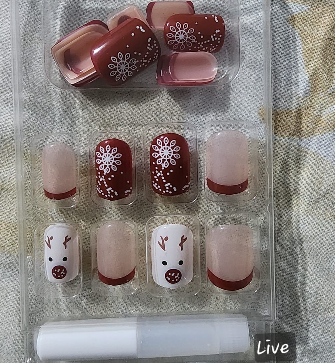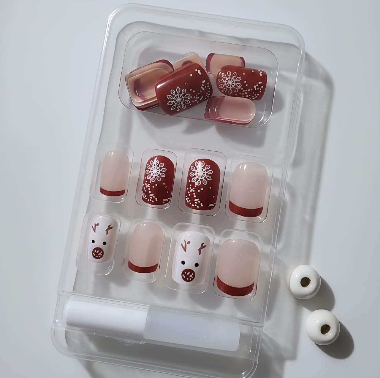 The Christmas Snow Reindeer Nails bring festive joy straight to your fingertips with adorable reindeer art, snowflake shimmer and a classic winter red-and-white palette. Designed as a 24-size handmade press-on set, this collection gives you more fitting flexibility than regular sets, making it perfect for both kids (10+), teens and adults who want a quick holiday-ready manicure.