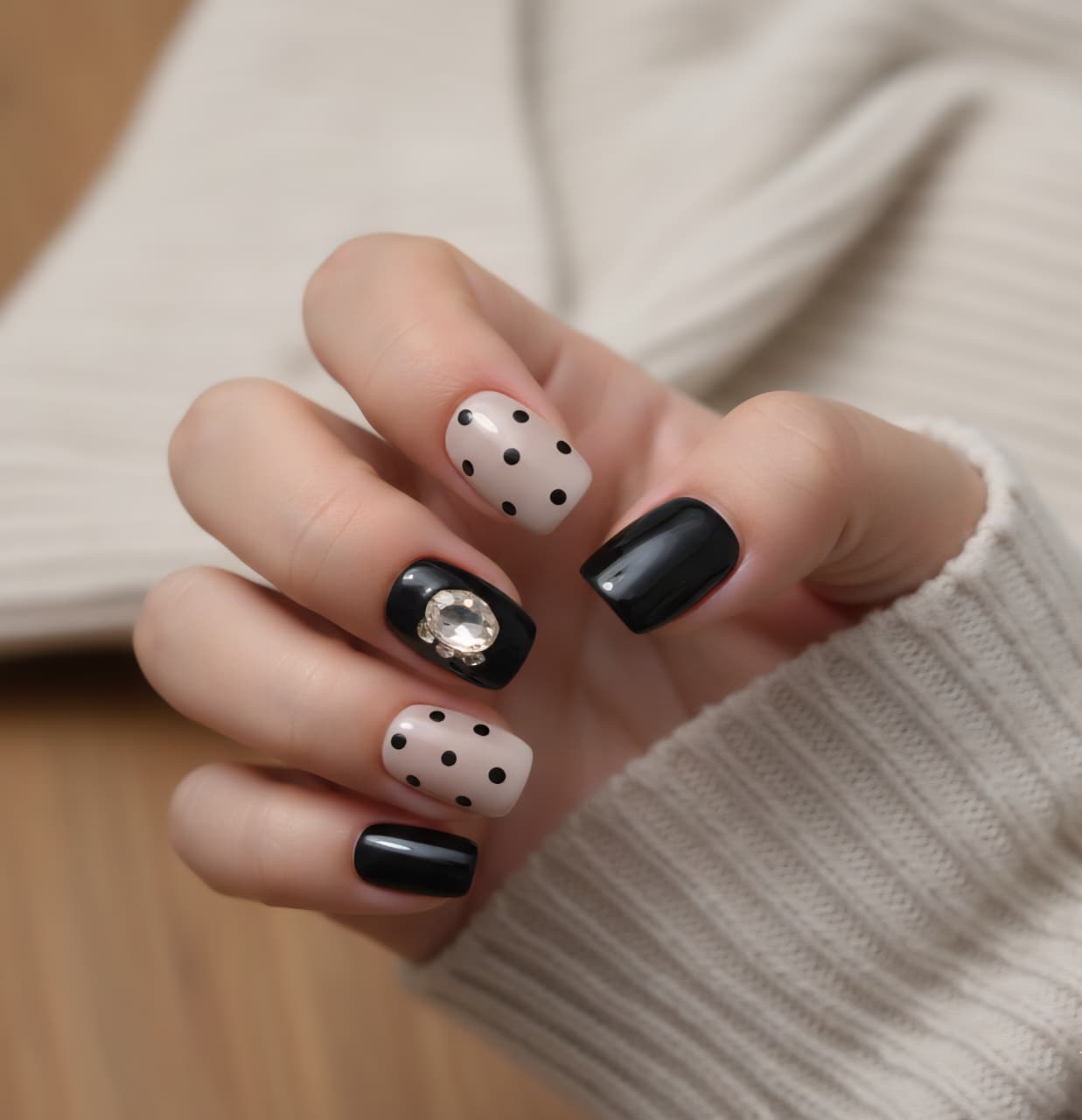 🖤 Bold Gloss, Diamond Sparkle & Playful Polka Hearts Short Nails