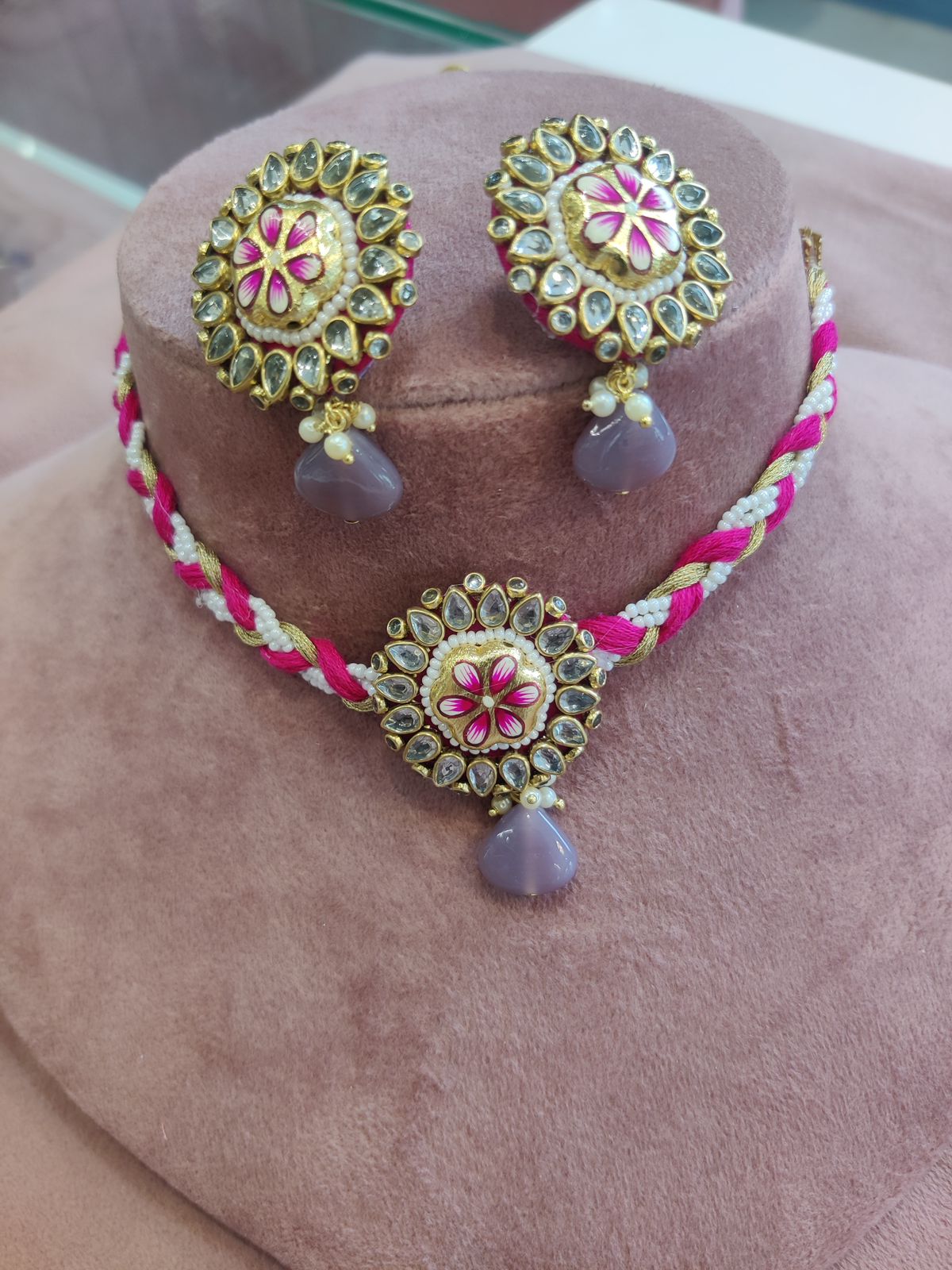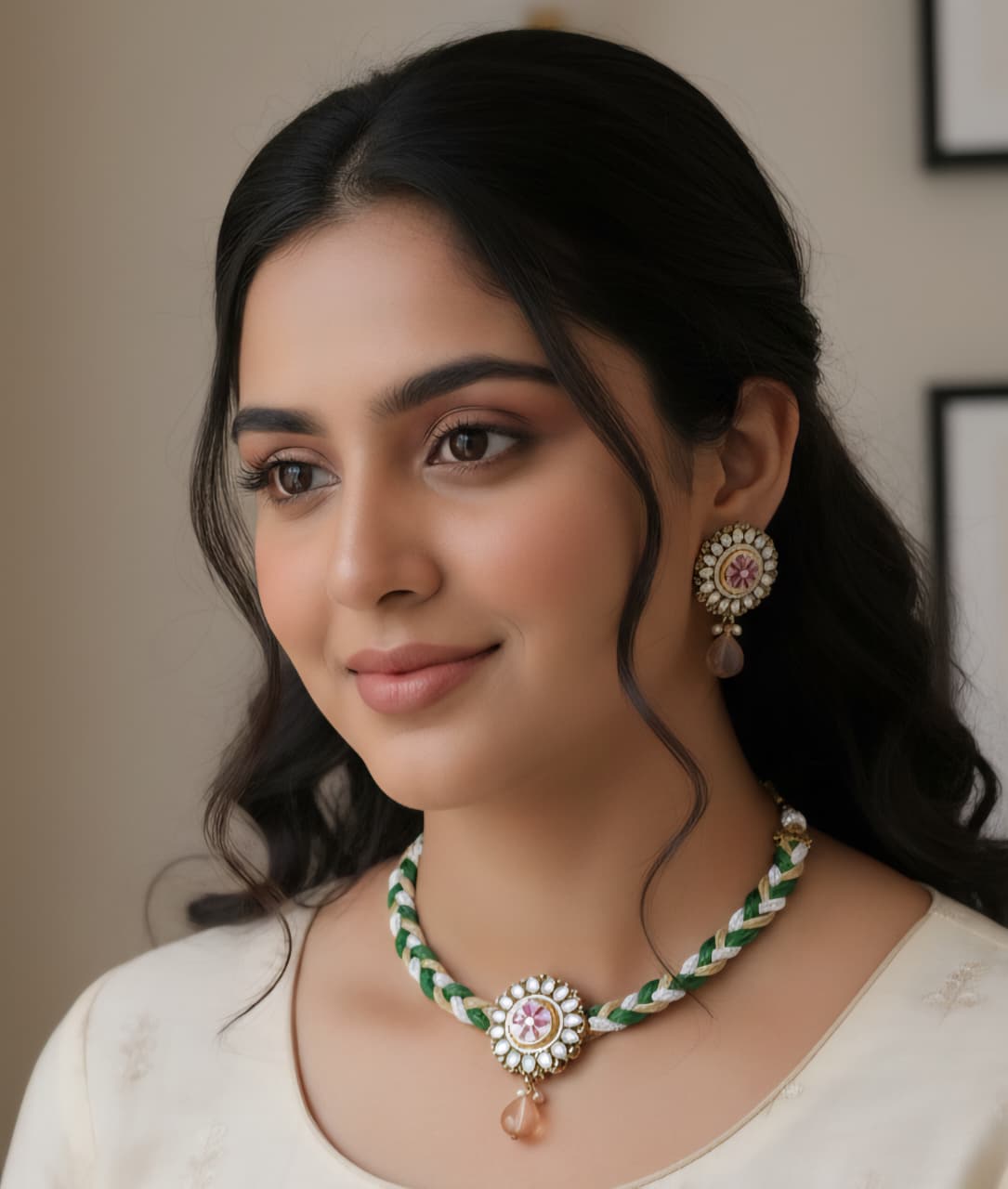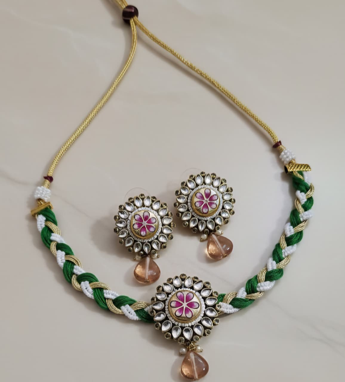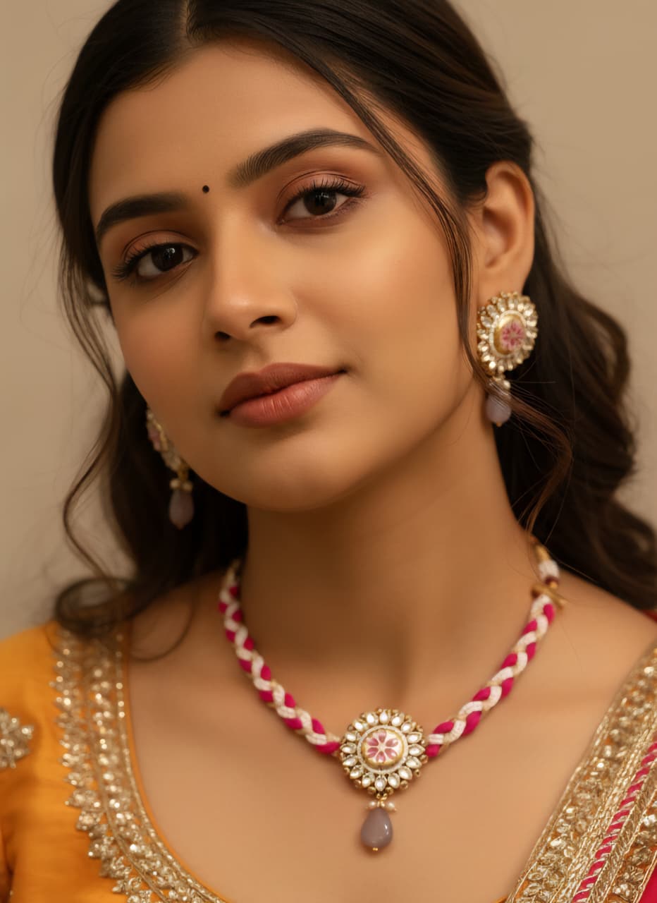 Besides that, the craftsmanship gives the set its charm. Skilled artisans shape, assemble and decorate every piece with attention to detail, ensuring a premium finish and graceful look. Additionally, the lightweight structure makes the jewellery comfortable for long hours during ceremonies, functions and festive gatherings. You can style the necklace close to the neckline for a traditional appeal or layer it with modern outfits for a fusion-inspired aesthetic. The earrings complement the necklace beautifully, completing the regal statement without overpowering your outfit.
