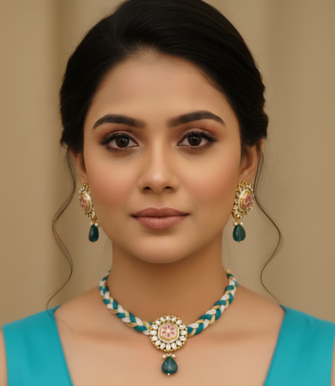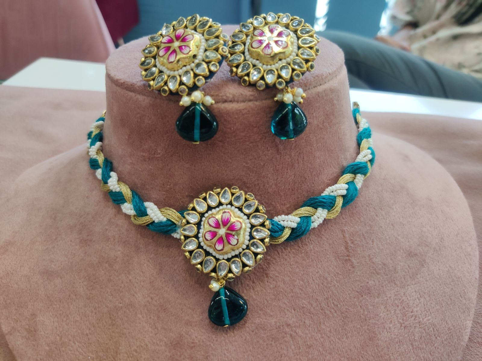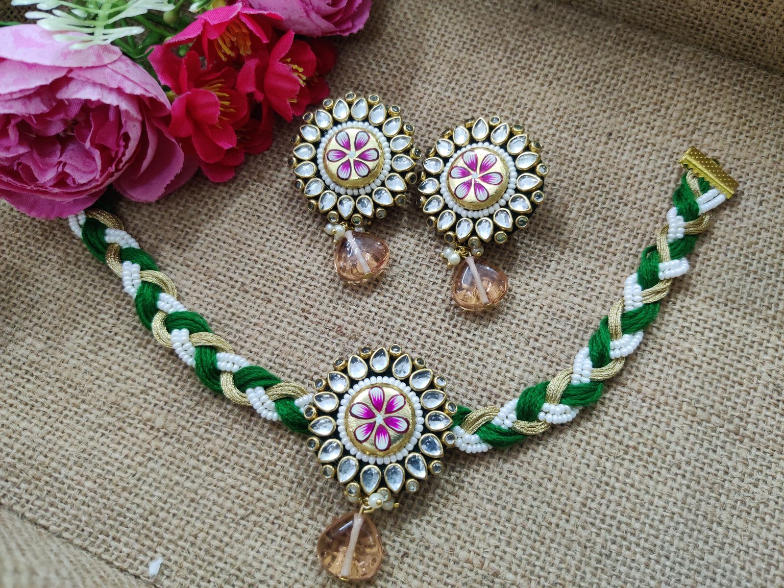 Besides that, the craftsmanship gives the set its charm. Skilled artisans shape, assemble and decorate every piece with attention to detail, ensuring a premium finish and graceful look. Additionally, the lightweight structure makes the jewellery comfortable for long hours during ceremonies, functions and festive gatherings. You can style the necklace close to the neckline for a traditional appeal or layer it with modern outfits for a fusion-inspired aesthetic. The earrings complement the necklace beautifully, completing the regal statement without overpowering your outfit.