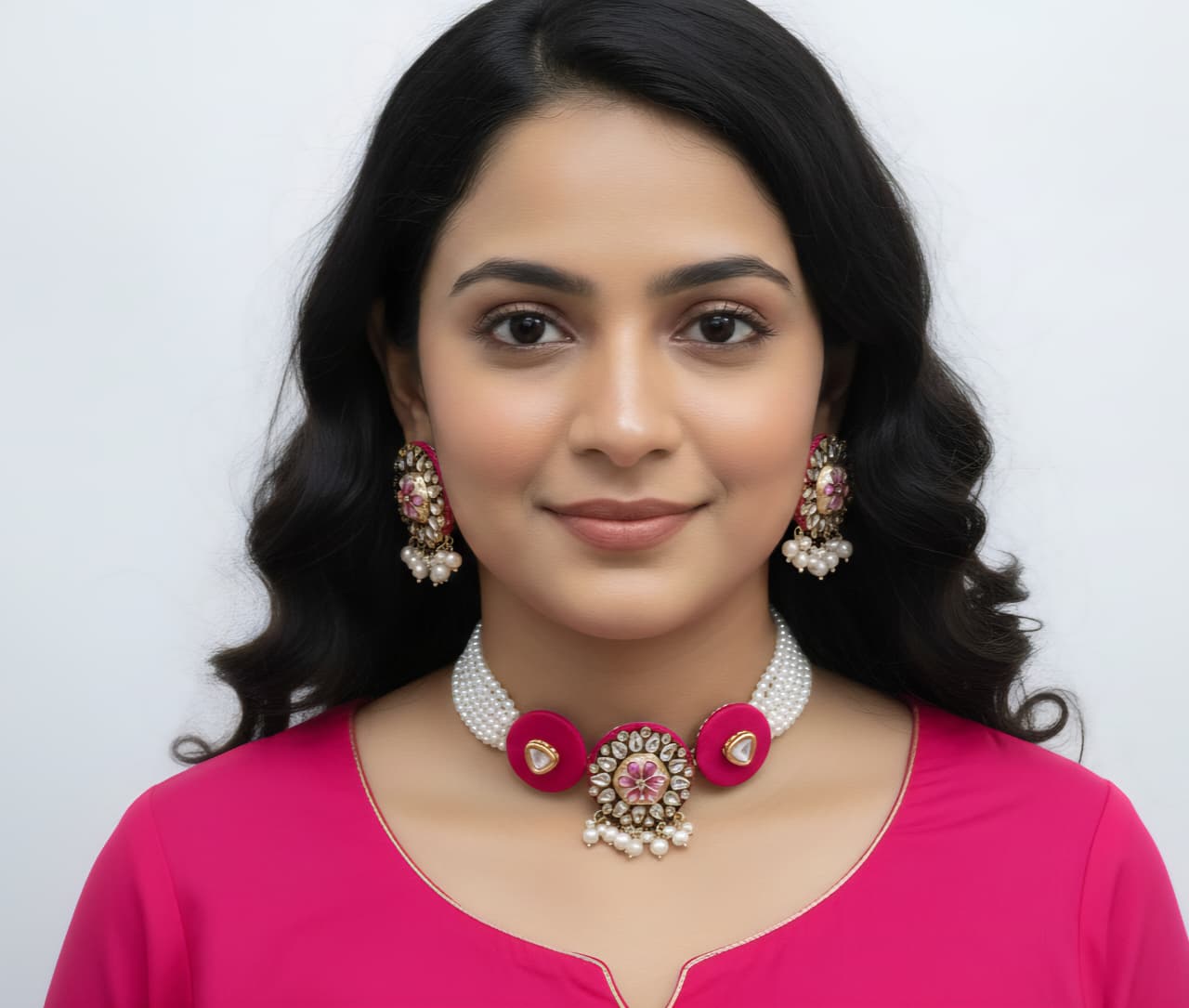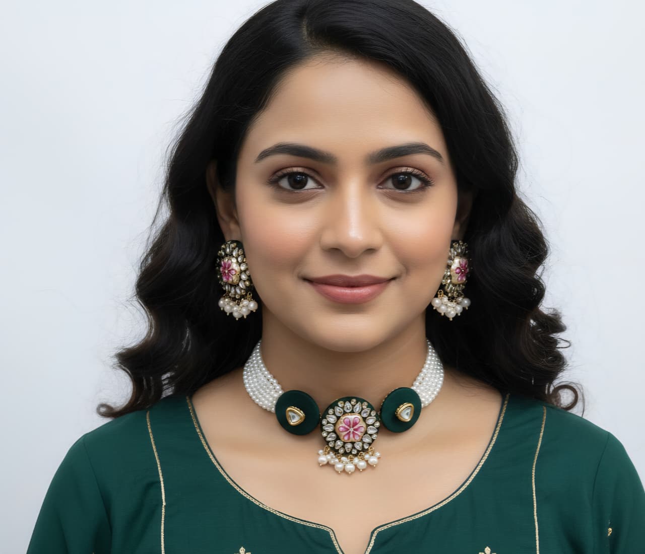 The choker stays lightweight on your skin, and the earrings remain soft on your ears. Therefore, long event hours feel comfortable. With reusable finish quality, you can wear the set multiple times across festive and wedding seasons. Each piece keeps its form and polish when stored safely. Additionally, 4 rich color variants – Pink, Maroon, Yellow, and Green – make outfit pairing easier. So, you can style confidently for haldi looks, wedding mornings, curated festive frames, evening functions, and engagement shoots.