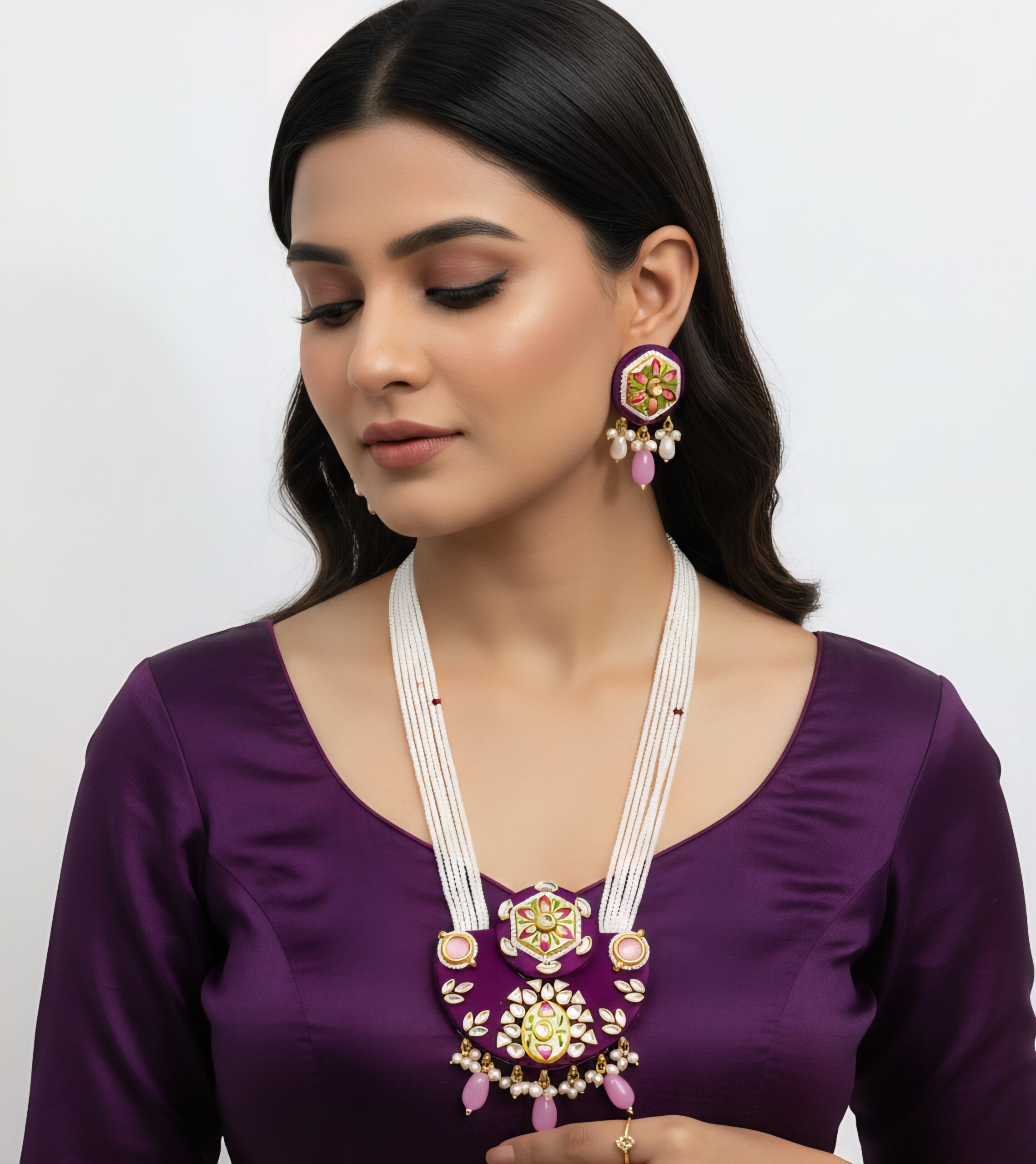 The pearls offer a soft, graceful glow, while the handcrafted motifs introduce a hint of royal Indian heritage. Furthermore, the earrings complement the necklace beautifully, completing the ensemble with an elegant touch. This combination makes the Hasti Heritage Long Pearl Set ideal for gifting, styling or adding luxury to your own collection. Each color brings its own charm, giving you the freedom to choose the one that best enhances your beauty.