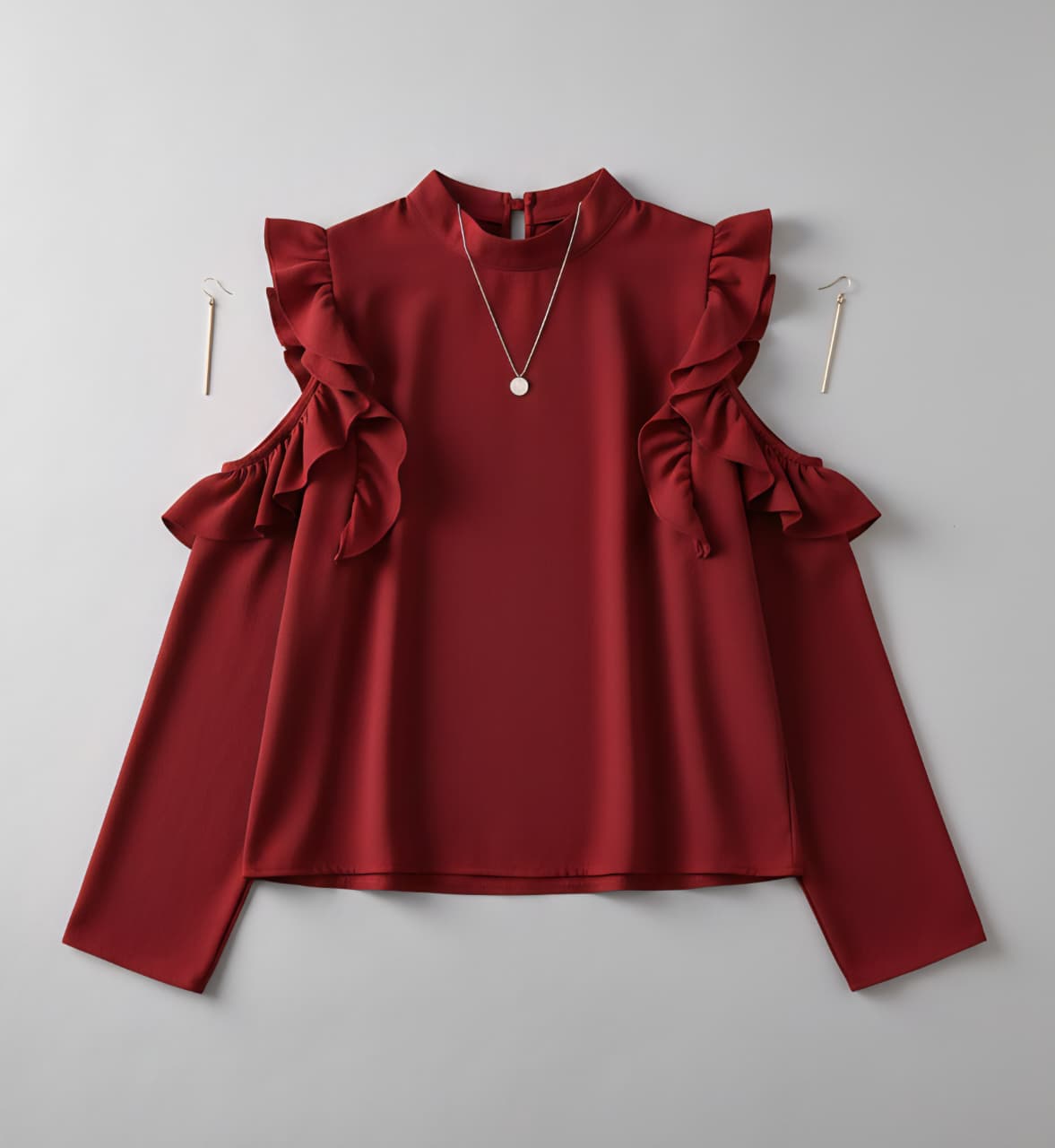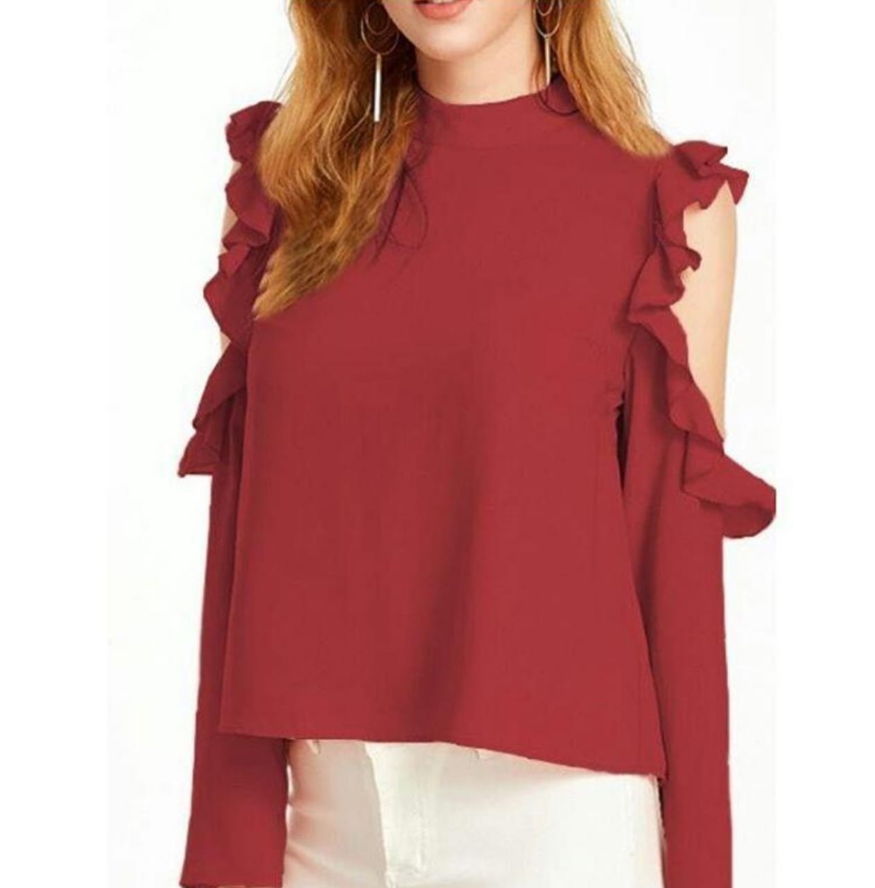The Maroon Ruffle Sleeves Imported Top is designed to bring effortless elegance to your wardrobe. Crafted from high-quality imported polyester fabric, this top offers a smooth, soft feel with beautiful fall and structure. The rich maroon shade adds a luxurious touch, while the layered ruffle sleeves create a stylish, feminine silhouette ideal for parties, dinners, dates, office styling and festive casual looks.