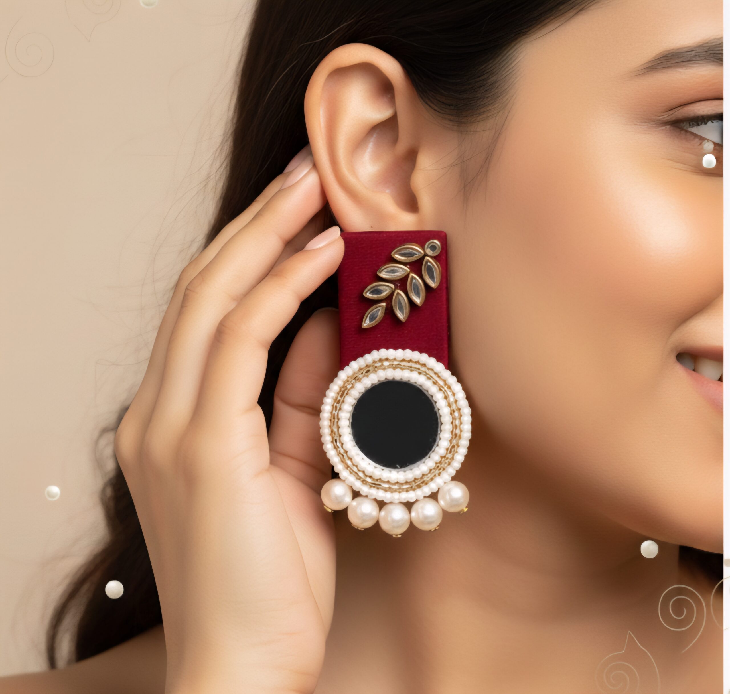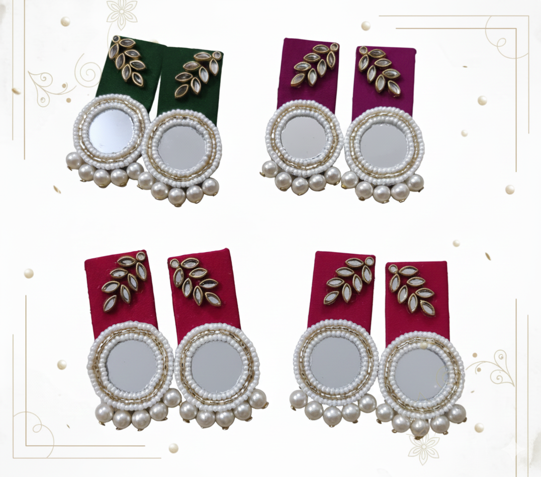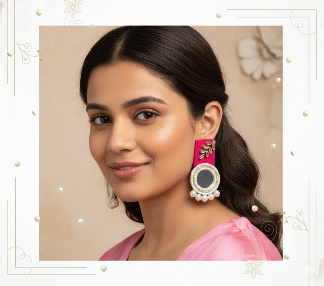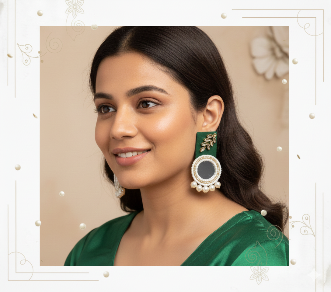 Upgrade your ethnic wardrobe with the Morni Kundan Pearl/Moti Earrings, a handmade design created to add royal charm to your festive and wedding looks. First, the peacock-circle pattern brings a heritage touch that instantly enhances your face frame. Meanwhile, the kundan stones reflect light beautifully, so your earrings sparkle in every moment. Additionally, the pearl and moti bead finish balances the shine perfectly, making it lightweight, classy and comfortable for long wear. Therefore, this set becomes a natural match for sarees, kurtis, lehengas, gowns and modern ethnic outfits. Layer it with chokers or keep it as a statement piece — both ways feel stylish and complete.
